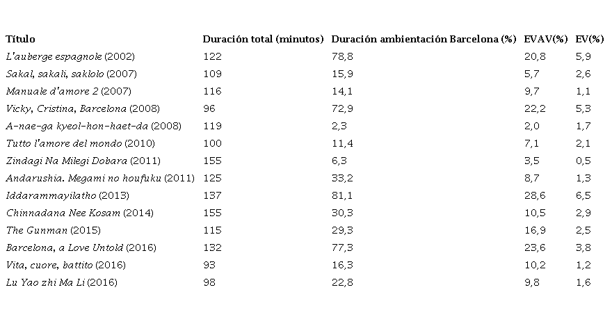 Para ello, del total de películas rodadas y ambientadas en Barcelona entre 2000 y 2017 se ha seleccionado una muestra. Los criterios de selección han sido los siguientes: los personajes son turistas, visitantes o residentes temporales extranjeros; la ciudad tiene un papel importante en el desarrollo de la trama; son producciones o coproducciones extranjeras orientadas prioritariamente a públicos foráneos, y deben haber tenido una importante audiencia. Solo catorce películas cumplen todos estos requisitos (Tabla 1).