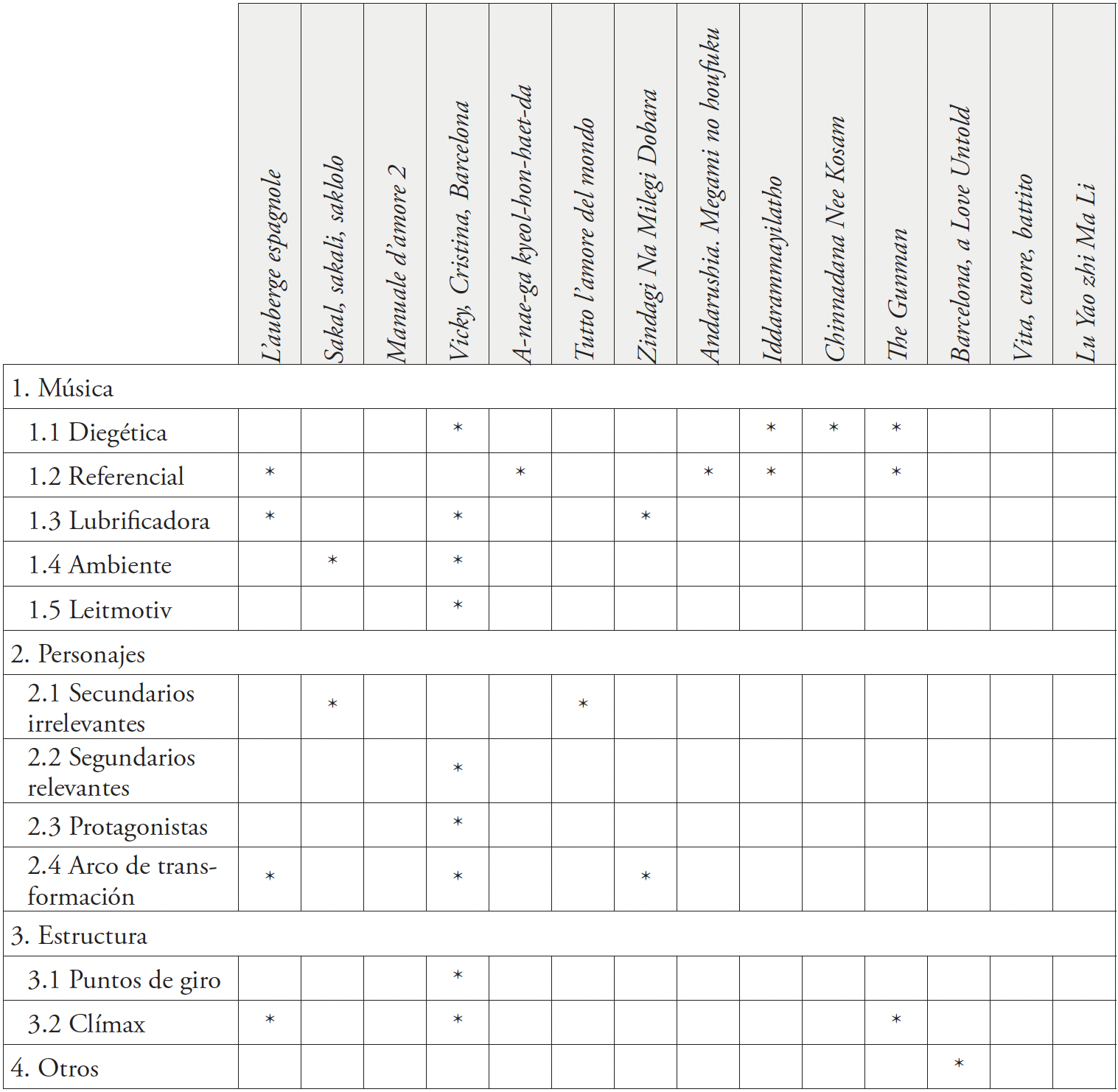 Respecto a la música referencial (1.2), la presentación de Barcelona viene acompañada de música de raíz andaluza, ya sea flamenco o rumba, en My Wife Got Married y en Andarushia. Megami no houfuku y Iddarammayilatho. Excepto Andarushia. Megami no houfuku, en todas las demás se recurre para la presentación a secuencias de montaje, por lo que la música también lubrifica y unifica (1.3). Estas son empleadas igualmente para describir la ciudad de Barcelona y para condensar tiempo de la historia, siempre paseos por sus calles donde los personajes disfrutan de sus atractivos. Así sucede en Vicky, Cristina, Barcelona y Zindagi Na Milegi Dobara. A estas podríamos añadir los créditos de L’auberge espagnole, prolepsis que resume la historia que con posterioridad se narra, que recurre a un tema de fusión donde es apreciable un pasodoble taurino con algunos “olés”.