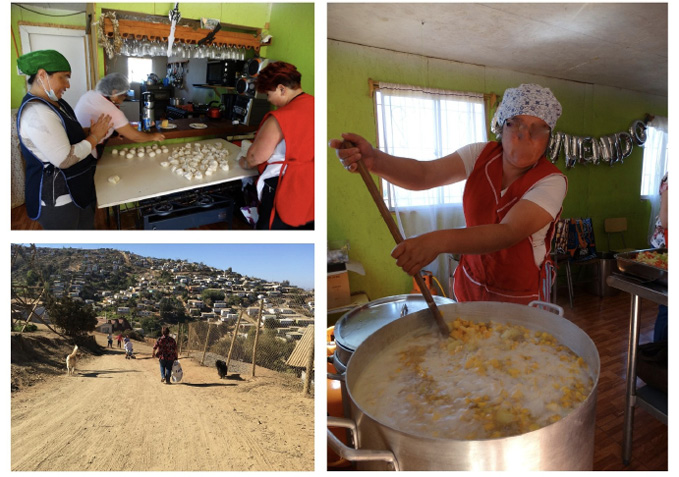 Históricamente, las mujeres en las poblaciones han tenido un rol fundamental en el cuidado, por ejemplo ayudando a solventar las necesidades alimentarias de la comunidad por medio de la organización de comedores infantiles primero, y realizando ollas comunes después. Si bien estas eran instancias que históricamente extendían el rol tradicional otorgado a la mujer, al mismo tiempo se las reconocía como espacios para desarrollar y forjar lazos con la comunidad. Según Valdés y Weinstein (1993), las ollas comunes tienen un antecedente inmediato en los comedores populares que organizó la Iglesia católica en medio de la crisis económica tras el golpe de Estado de 1973. Entre 1975 y 1976 se expandieron por distintas poblaciones, de manera tal que, en 1976, funcionaban 263 comedores solo en Santiago. Más adelante, y debido a los intensos temporales de 1982, el surgimiento de nuevas ollas comunes se intensificó, cuando las familias comenzaron a cocinar juntas y levantaron formas de organización social que se abocaron a la resolución de un problema tan básico como la alimentación diaria de quienes no podían hacerlo con medios propios. Sin embargo, con la mayor disponibilidad de recursos durante la década de 1990, las ollas comunes fueron desapareciendo, quedando en la memoria histórica de las organizaciones sociales.