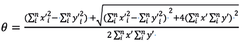 Con estas dos distancias estándar, que son ortogonales (perpendiculares) entre sí, se obtienen los ejes mayor y menor de la elipse, los cuales definen su extensión. Además, es posible calcular su ángulo de rotación, tomando la dirección norte como referencia, al buscar la distancia mínima de todos los puntos para con el eje mayor, y la distancia máxima para con el menor. Esto permite establecer, en promedio, cuánto y hacia cuál dirección se expanden los delitos con respecto del centro medio de todos los eventos. El cálculo de este eje de rotación se expresa formalmente como se indica en la ecuación 3.