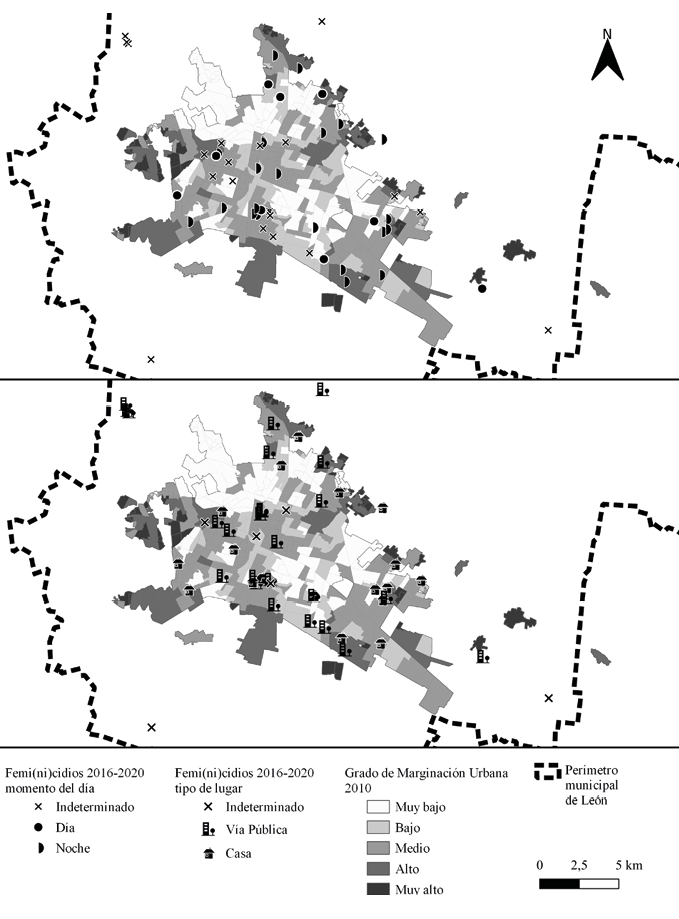 Resumen: Este artículo presenta un análisis espacio-temporal sobre asesinatos de mujeres en León, Guanajuato. A partir de los crímenes georreferenciados (2016-2020) por María Salguero, se proponen algunas hipótesis estadísticas para estudiar sus posibles patrones espaciales. Con ellas se argumenta que femicidios y feminicidios son perpetrados bajo ciertas condiciones ambientales, como el tipo de lugar y el momento del día. Este fenómeno ocurre casi exclusivamente dentro de la zona urbanizada del municipio, y ha variado en su distribución espacial año con año. Los crímenes han tendido a suceder en zonas con un grado de marginación urbana medio, y en zonas de transición entre grados alto y bajo. Una posible medida para su ocurrencia en la vía pública es atender puntos específicos de la ciudad, pero los cometidos en domicilios presentan una distribución aleatoria, lo que sugiere que cualquiera podría ser escenario de un feminicidio. Concluimos con un conjunto de reflexiones y nuevas hipótesis posibles de estudiar.