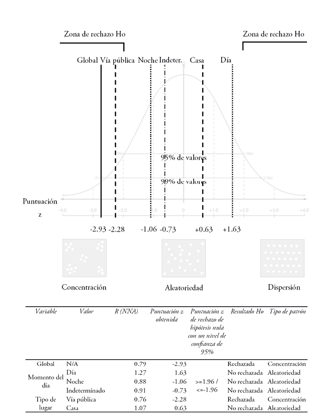 Partimos de la hipótesis nula (Ho) de que: a) la distribución de estos delitos es aleatoria, ante lo cual se proponen las hipótesis alternativas (Ha) de que estos pueden presentar; b) un patrón de concentración; o c) un patrón de dispersión. Con un nivel de confianza establecido en 95%, y con una probabilidad de cometer un error α = 0,05, este conjunto de hipótesis y sus correspondientes puntuaciones z se expresan formalmente como: