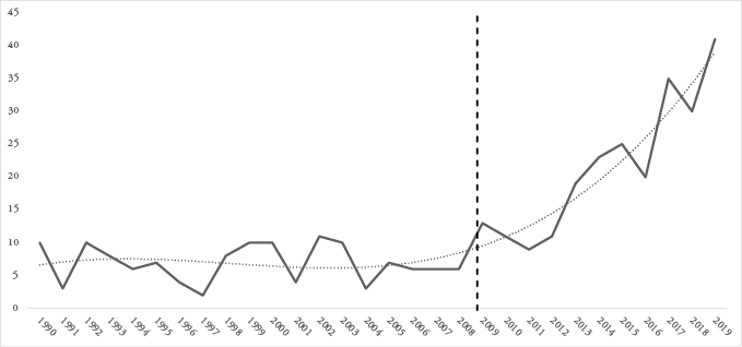 En una línea del tiempo para León, se puede notar de forma más pronunciada la acentuación del problema (Figura 2). La línea vertical entrecortada indica el momento aproximado en el cual los femi[ni]cidios comenzaron a mostrar una tendencia claramente ascendente, con lo cual se ponen en relieve dos comportamientos opuestos en la comisión de estos crímenes: uno “estacionario” por casi veinte años, y otro exponencial, en un plazo de una década. Dicho de otra forma, los femi[ni]cidios se duplicaron de 125 a 243, aproximadamente, en la mitad de tiempo.