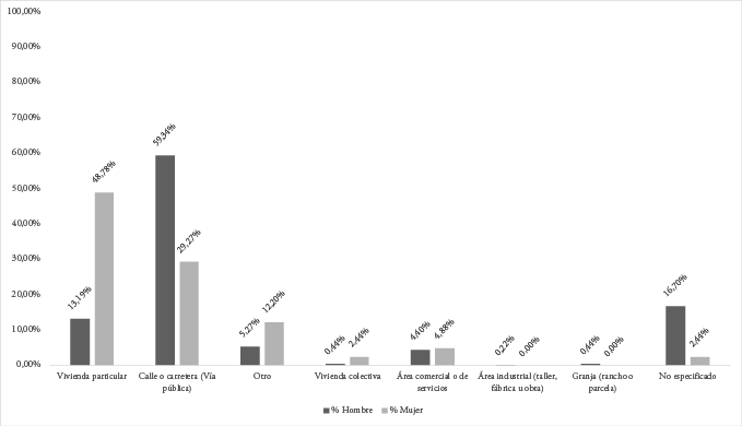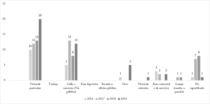 Sin embargo, esta primera gráfica no permite acercarnos a las especificidades espaciales. Para ello, desagregamos estos crímenes según el lugar donde ocurrieron, tomando el año 2019 como base (Figura 3). El resultado permite brindar evidencia a lo mencionado por Berlanga sobre la asignación espacial de las mujeres al hogar en sociedades patriarcales, donde en lugar de estar más protegidas, resultan más victimizadas.