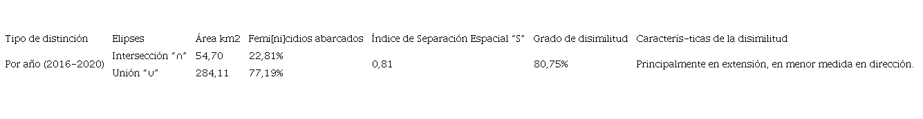 Este procedimiento se realizó para la nube de puntos correspondientes a cada año, del 2016 al 2020. Ello resultó en cinco elipses que, al ser superpuestas, permiten examinar si el patrón de extensión y dirección de los femi[ni]cidios varió año con año, o si se mantuvo estacionario, lo cual es expuesto en los resultados.