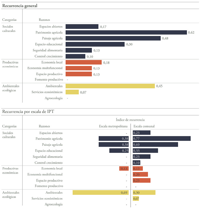 El análisis del índice de recurrencia por escala de planificación (metropolitana versus comunal) pone de relevancia que las razones más recurrentes tienden a coincidir en ambas escalas. Las razones de patrimonio agrícola y paisaje agrícola de la categoría sociocultural y las razones ambientales de la categoría ambientalecológica son las que, en términos generales, tienen mayores índices en ambas escalas. Sin embargo, las razones socioculturales tienen un mayor índice de recurrencia a escala comunal –0,77 patrimonio y 0,60 paisaje– y las ambientales-ecológicas a escala metropolitana –ambientales 0,69–.