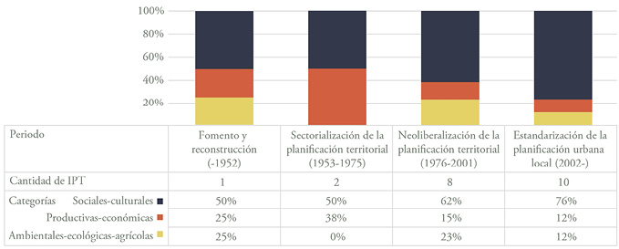 Finalmente, se evaluó la importancia dada a cada categoría de razones (Figura 4) en cada uno de los periodos analizados. Para esto se consideraron los IPT elaborados en cada periodo, calculando el porcentaje que representa la recurrencia del conjunto de razones de cada categoría respecto del total. Esto permitió evaluar la evolución de los distintos ámbitos de la sustentabilidad en la concepción de la AU desde la planificación urbana.