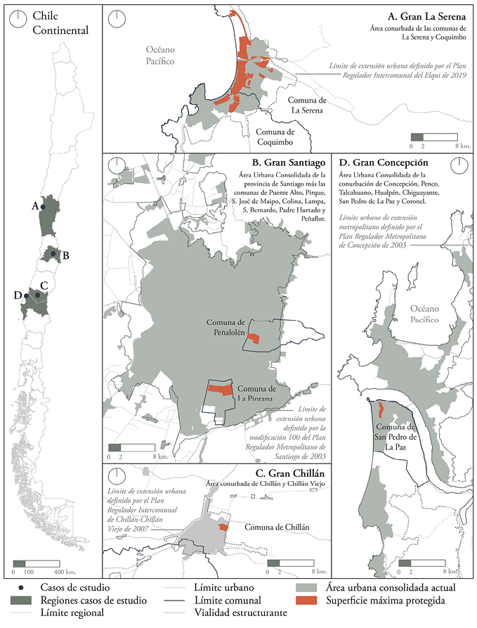 Con objeto de generar conocimiento integrador sobre cómo la planificación urbana chilena ha concebido la AU, se consideraron cinco casos de estudio, ubicados en cuatro conurbaciones: Gran La Serena, Gran Santiago, Gran Chillán y Gran Concepción (Figura 2). En todos estos casos existió en el algún momento al menos un IPT de escala comunal o intercomunal que consideró la agricultura dentro de la zona urbana. Los casos encontrados se delimitaron en función del ámbito de AU, independientemente de los límites administrativos. Así, en el Gran La Serena, a pesar de implicar dos comunas –La Serena y Coquimbo–, se identificó un único caso por la continuidad espacial del ámbito. En el Gran Santiago, las comunas de Peñalolén y La Pintana se identificaron como dos casos independientes por su discontinuidad espacial.