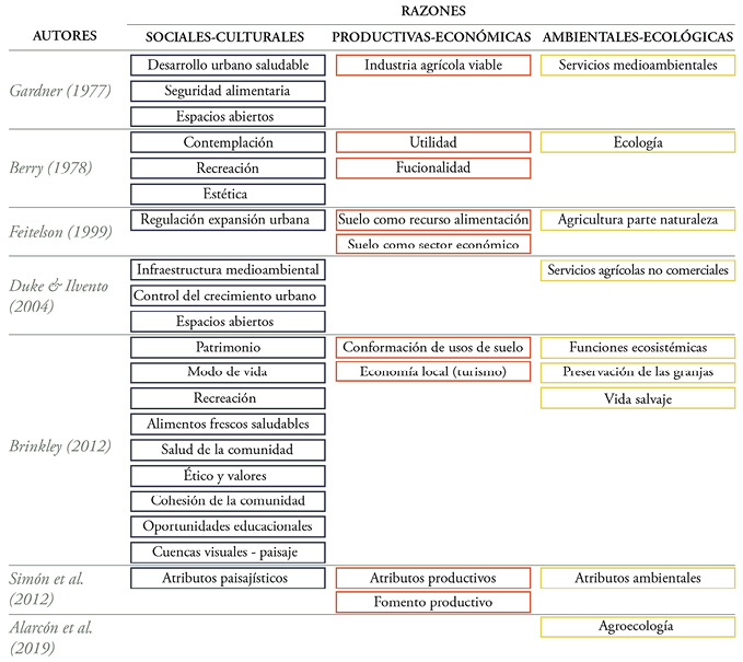 En la década de 1990, Nelson (1992), desde EE.UU., resalta tres razones de protección de la AU: cultivo de productos agrícolas especializados, provisión de bienes públicos ambientales y generación de espacios abiertos para definir espacialmente las áreas urbanas. Por otro lado, Feitelson (1999) recoge cuatro razones aplicadas en la planificación de Israel: dos argumentos productivistas, como sector económico y como recurso de alimentos; un argumento urbano-céntrico, como medio de contención del crecimiento urbano; y un argumento ambiental, como proveedor de externalidades positivas.
