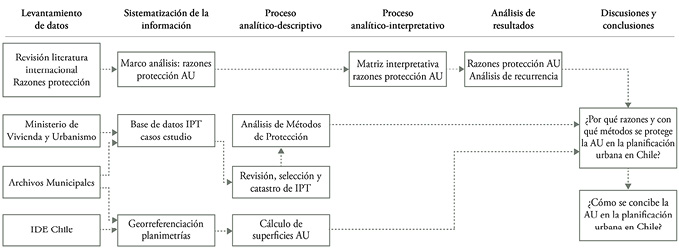Para revelar cómo la AU ha sido concebida en la planificación urbana en Chile en las últimas décadas, se profundizó en dos dimensiones: el cómo y el por qué los IPT de los casos estudiados consideraron y protegieron la AU. Se empleó una metodología mixta que permitió, en una primera fase, identificar los IPT que consideraron la AU, en qué magnitud y qué métodos aplicaron para protegerla; en una segunda, atribuir las razones de cada IPT para considerar y proteger la AU; y, finalmente, generalizar los resultados para responder la pregunta inicial (Figura 3).