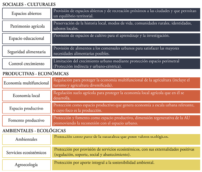En resumen, las razones recopiladas por los diferentes autores a lo largo de las últimas décadas mantienen algunas constantes, aunque evolucionan nuevos conceptos. En la dimensión social, los espacios abiertos y el desarrollo urbano saludable en función del contexto temporal son constantes. En la dimensión económica o productiva, el sector agrícola viable se mantiene, aunque adquiere diferentes matices según el momento. En la dimensión ambiental, siempre se propone una visión ecológica de prestación de servicios ambientales que, en el siglo XXI, se reorienta a la prestación de servicios ecosistémicos (Zhan et al., 2007). En la última década, aparecen los conceptos de fomento productivo, patrimonio, paisaje, y agroecología.