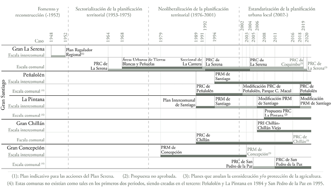 El análisis histórico de la planificación urbana en Chile revela una marcada división urbano-rural y una progresiva estandarización de los instrumentos, siendo posible identificar cuatro periodos diferentes.