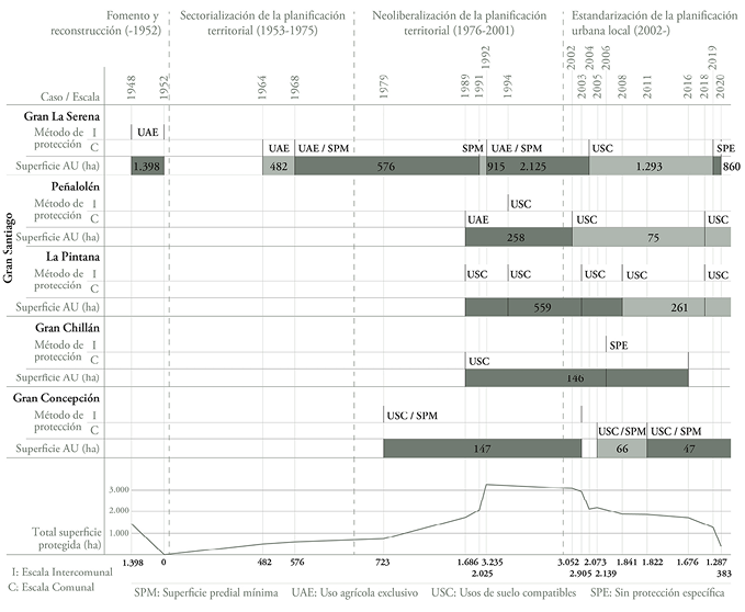 En el Gran Chillán, dos IPT protegieron 146 ha por USC mediante el uso de equipamiento educacional: el PRC de 1989 y el PRI de 2006. El PRC de 2016 dejó este espacio SPE, permitiendo la futura transformación del suelo en habitacional. En el Gran Concepción, los IPT de ambas escalas combinaron USC y SPM. El PRM de 1979 protegió 147 ha como zona de parcelas con SPM de 5000 m2. Los PRC de 2005 y 2011 protegieron, como zona productiva hortícola con restricción de uso y límite máximo en la subdivisión predial, una zona que fue reduciéndose hasta las 47 ha.