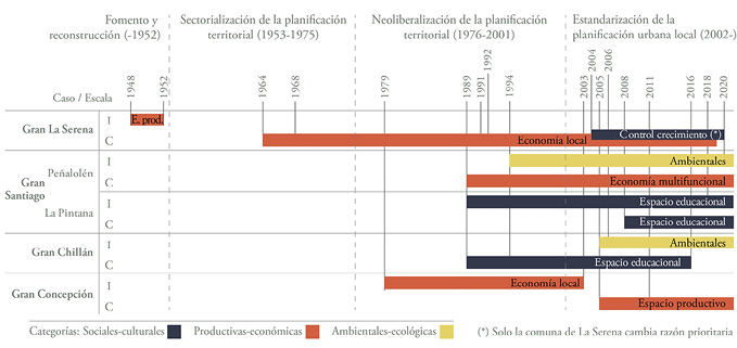 Los resultados de este análisis se muestran de dos maneras. Un diagrama temporal visibiliza las razones prioritarias argumentadas por cada plan, clasificados por escala comunal y metropolitana, permitiendo el análisis de la evolución de las razones prioritarias por caso y desde qué escala fue considerada. Un segundo diagrama identifica el conjunto de razones que motivaron la consideración y protección de la AU en cada IPT seleccionado. Esta tabla permite visualizar la potencial visión multidimensional de los IPT.