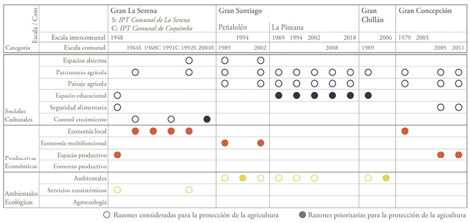 En el Gran Chillán, solo el primer PRC aportó una mirada multidimensional, incorporando razones ambientales-ecológicas a las socioculturales –espacio educacional y patrimonio agrícola–. El PRI de 2006 redujo el enfoque al argumento ambiental. El Gran Concepción aportó una perspectiva multidimensional combinando razones productivo-económicas, como prioritarias, con razones socioculturales. El primer PRM solo aportó dos razones de esta última categoría –patrimonio y paisaje agrícola–, mientras que los PRC de San Pedro de la Paz incluyeron su papel como proveedor de alimentos al Gran Concepción.