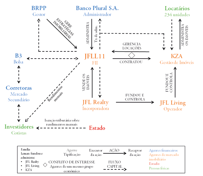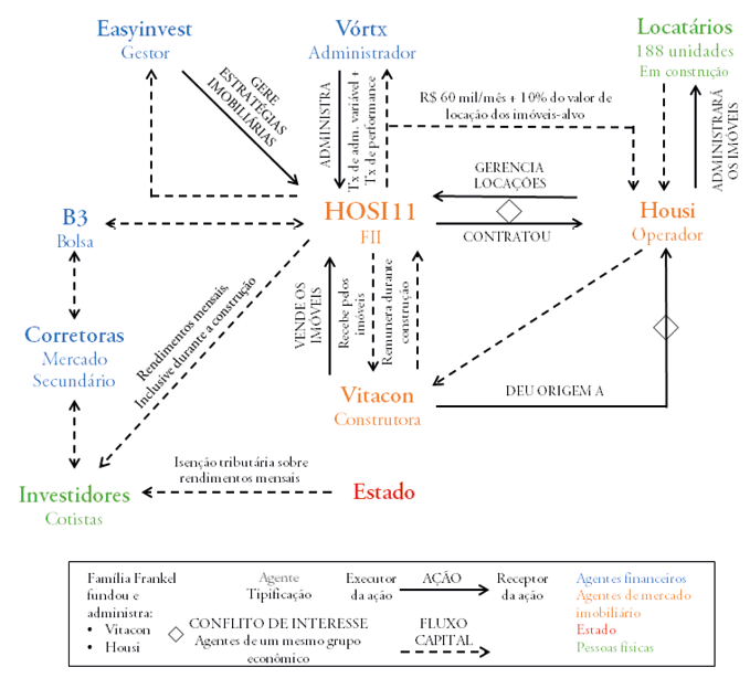 Uma estratégia complexa demanda nichos de experiência na operação dos mercados imobiliário e financeiro. O infográfico da Figura 2 permite entender a estruturação entre agentes ligados à operação do fundo sob a perspectiva de um sistema sociotécnico ao demonstrar quais tipos de ação de um agente incidem sobre outro. Adicionalmente, o infográfico mapeia a trilha do dinheiro que circula entre esses agentes.