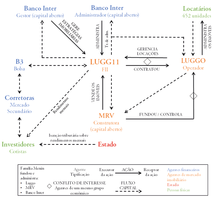 O Regulamento do Fundo estabelece a preferência de aquisição de imóveis produzidos pela mrv Engenharia e Participações S.A., construtora consolidada no mercado nacional que deu origem à Luggo. O Banco Inter, outra empresa do mesmo grupo familiar, é administrador e gestor do Fundo. Tanto o Banco Inter quanto a mrv têm capital aberto, denotando que esse grupo econômico avança em múltiplas direções no mercado de capitais. Além disso, o sistema sociotécnico (Figura 4) que opera o Fundo dá a entender que, ao se especializar no setor financeiro por meio do Banco Inter, na construção por meio da mrv, e na operação de aluguéis por meio da Luggo, o grupo detém uma estrutura que independe de agentes externos para expandir seu FII. Como as negociações acontecem entre agentes de um mesmo grupo econômico, os conflitos de interesse precisam ser aprovados em assembleia, o que não parece haver imposto impedimentos às operações. Além disso, o Regulamento já expressava, no momento da adesão, a necessidade de concordância dos cotistas com a operação do Fundo por agentes de um mesmo grupo econômico.