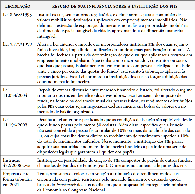 Os FIIs foram instituídos no Brasil em 1993 após uma década de crise econômica e hiperinflação. No contexto internacional, o pano de fundo era o avanço de políticas de privatização, liberalização do comércio internacional e desregulamentação de transações financeiras internacionais. Naquele momento, a instituição dos FIIs estava em linha com as políticas do governo Collor (1990-1993) devido ao alegado potencial de fortalecer o mercado financeiro brasileiro e atrair investimento estrangeiro (Sanfelici, 2017; Sanfelici & Halbert, 2019).