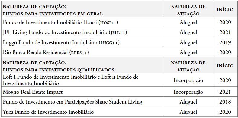 Em entrevista de Fabrício Mitre, CEO da Mitre Realty ao podcast1 Banco Imobiliário do InfoMoney, braço jornalístico da xp Investimentos, as falas evidenciam como novidade essa onda de fundos voltados ao segmento residencial. Contando a trajetória do fundo Share Student Living, joint venture da Mitre com a americana Redstone Residential, ele afirma que, no Brasil, o mercado de residencial para renda é “muito pouco desenvolvido, [e] muito pouco profissional”. Ao longo da entrevista, especula sobre novos anseios de vida urbana de pessoas mais jovens que seriam menos apegadas ao patrimônio fixo ao apontar que “é um mercado que tem muito a crescer e hoje existe uma clara tendência das pessoas [...] a buscarem mais flexibilidade”. Em face da nova tendência, aponta, então, que ela deve se refletir nos FIIs: “Hoje, os fundos imobiliários são de galpão, shopping e escritórios coorporativos e eu acho que a próxima grande rodada de fundo imobiliários nós vamos ver no mercado residencial, [...], porque isso oferece uma estabilidade bastante diferente desses outros mercados que são mais cíclicos, [...] e o mercado residencial ele tende a ser mais estável” (Podcast Banco Imobiliário, InfoMoney, 20/fev./2020, transcrito pelos autores).