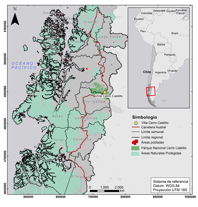 El área de estudio se ubica en la Patagonia-Aysén, en la XI Región de Aysén, entre las comunas de Río Ibáñez y Coyhaique. Específicamente, este artículo se centra en el sector de Cerro Castillo, que integra la localidad de Villa Cerro Castillo y los sectores rurales cercanos al Parque Nacional Cerro Castillo (en adelante PNCC), como se grafica en la Figura 1.