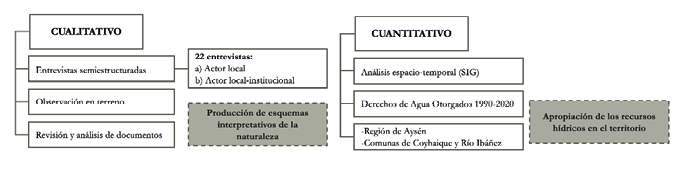 La metodología utilizada en el presente estudio es de carácter mixto, de alcance descriptivo y exploratorio. Se optó por articular instrumentos y técnicas metodológicas de tipo cualitativo y cuantitativo (Figura 3). Este marco permite la comprensión de las tensiones existentes en la Patagonia-Aysén de forma holística, y abre la posibilidad de desentrañar las complejidades sociales, culturales y espaciales en la configuración de territorios de alto valor ambiental.