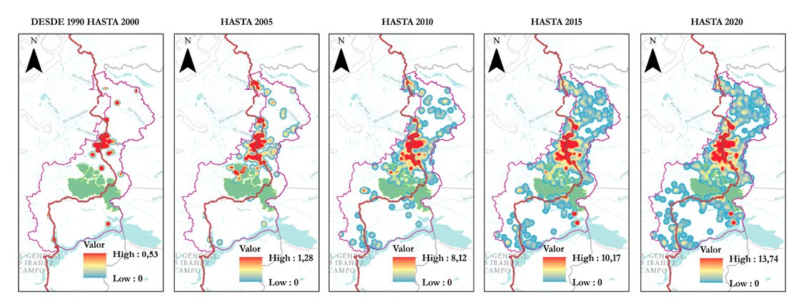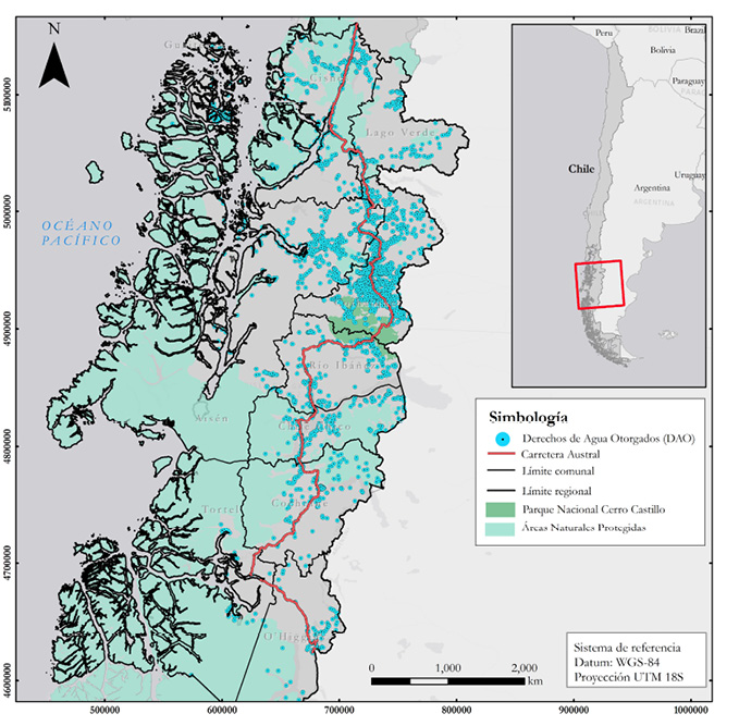 En segundo lugar, para analizar los procesos de acumulación de los recursos hídricos se trabajó con los datos de Derechos de Aguas Otorgados (en adelante DAO) entre los años 1990 y 2020, levantados por la DGA, a través de la utilización de Sistemas de Información Geográfica (SIG). De esta manera, se identificó la zona con mayor concentración de DAO en la Región de Aysén. A partir de lo anterior, se consideraron las comunas de Coyhaique y Río Ibáñez como relevantes para el análisis territorial, siendo el PNCC la zona núcleo, a partir de la cual se determinó la densidad de concentración de DAO de forma temporal. Finalmente, se realizó una descripción del comportamiento de los DAO próximos al PNCC entre los años estudiados.