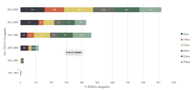 Si centramos nuestro análisis solo en los DAO próximos al PNCC, considerando un radio de 30 kilómetros, se observa una relación directamente proporcional entre los flujos de privatización del agua y la cercanía con esta ANP (Figura 6), situación que se acentúa en la última década. Específicamente, en su círculo más próximo –cinco kilómetros– desde 2005 se puede probar un incremento notorio de DAO.