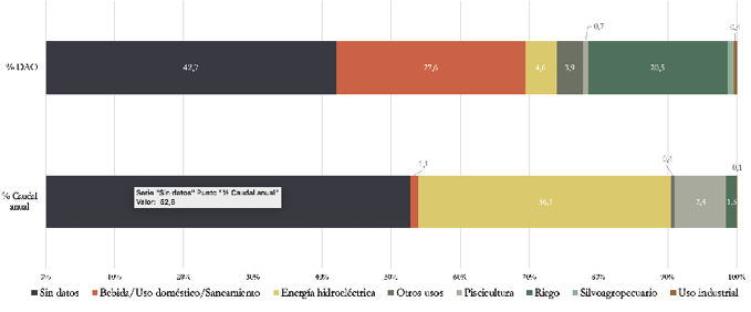 Por otra parte, los principales usos declarados son bebida/uso doméstico/saneamiento y riego (27%, 6% y 20,5% respectivamente), pero representan una baja proporción del caudal total (1,1% y 1,5% respectivamente). Por otra parte, el mayor porcentaje de caudal anual se relaciona con la generación de energía hidroeléctrica (36,7%) representando tan solo el 4,6% del total de los DAO (Figura 7). Finalmente, el % de los DAO no presentan información acerca del uso y el caudal que se han otorgado, lo cual representa un vacío importante.