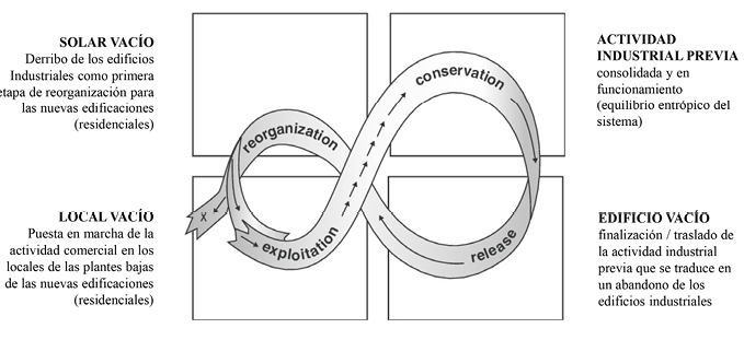 Finalmente, la Figura 8 identifica y caracteriza las distintas tipologías del vacío urbano en relación/analogía con las sucesivas etapas (stages) del ciclo adaptativo. Así, la actividad industrial previa representa la consolidación (fase K – conservación) del ciclo urbano anterior, que inicia un nuevo ciclo tras el cese/traslado de la actividad económica (fase Ω – liberación), continúa con la fase substitución por nuevas edificaciones –empezando por el derribo de las anteriores (fase α – reorganización)– y finaliza con la utilización de los nuevos espacios (fase r – explotación). Según nuestro análisis, cada una de estas etapas se caracteriza por las distintas y sucesivas formas que adopta el vacío urbano a lo largo del proceso.