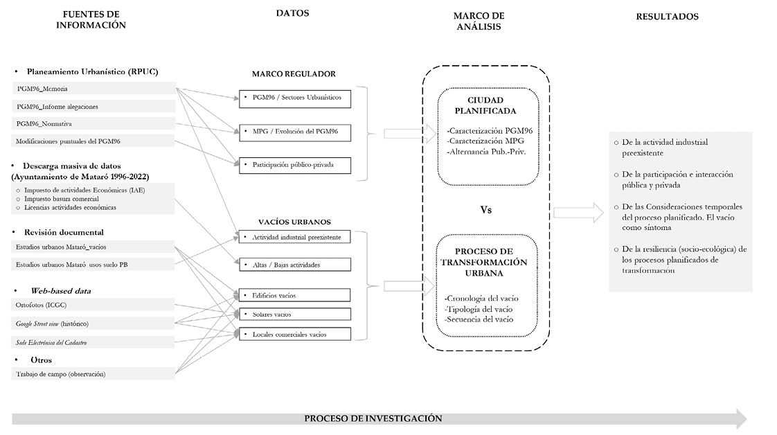 El artículo aborda el análisis del proceso de transformación de las áreas industriales interiores de la ciudad de Mataró (Barcelona) en el período comprendido desde 1996 (año de aprobación del PGM96) hasta el año 2021. El objeto de análisis del trabajo está constituido por los Sectores de Remodelación (clave 5) y los Sectores de Reindustrialización (clave 2b) delimitados por el PGM96. Por su parte, el objetivo es evaluar el nivel de resiliencia –socioecológica– del proceso planificado de transformación, a partir de su capacidad para favorecer/posibilitar (navigate) dicho proceso. En este sentido, el estudio toma el vacío urbano, en sus distintas modalidades, como elemento de análisis, en tanto que síntoma de la disfunción producida por las limitaciones de la disciplina urbanística para abordar la naturaleza compleja del sistema urbano. La Figura 3 muestra las distintas etapas del proceso de investigación a través de las cuales podemos llegar a comparar la teórica transformación planificada y la realidad urbana del vacío.
