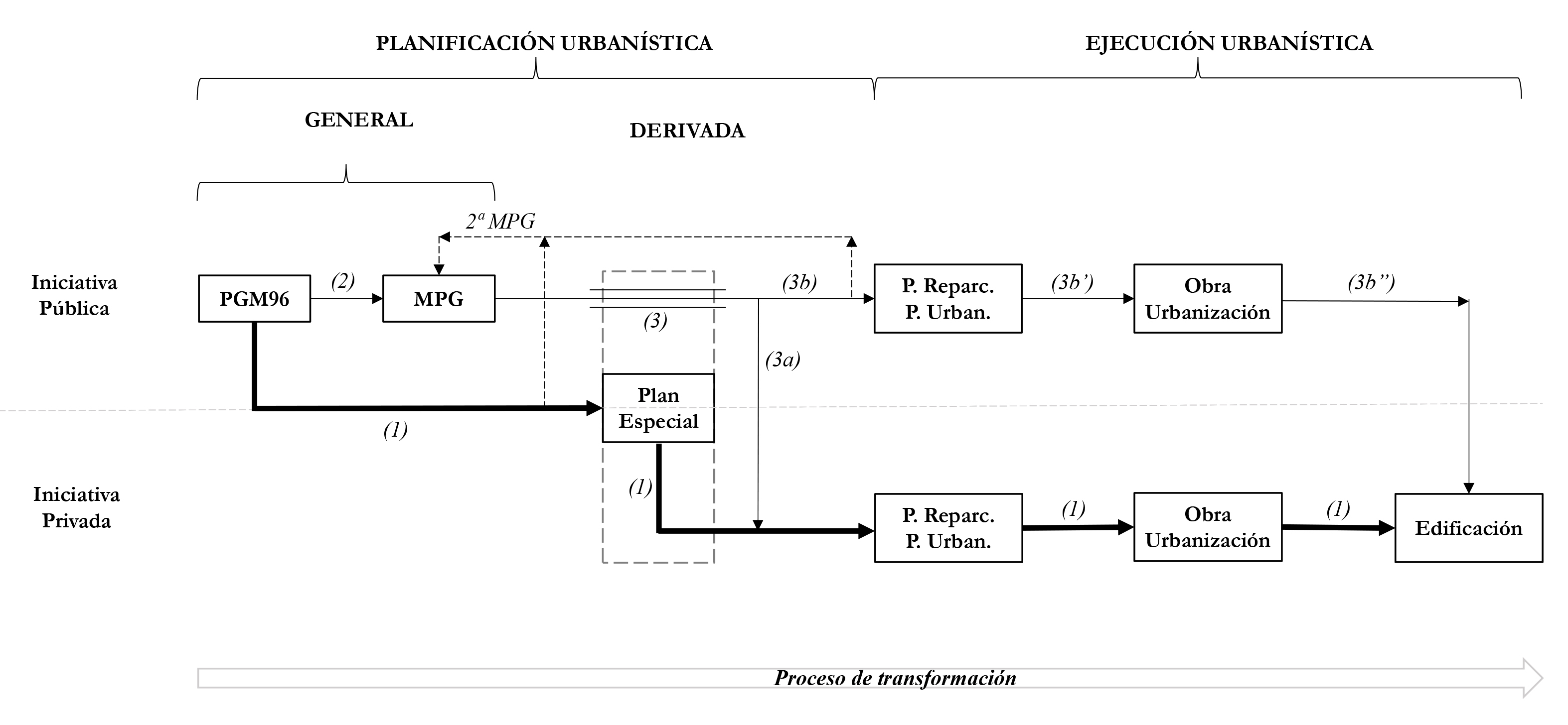 Según el PGM96, el desarrollo de los sectores urbanísticos 2b y 5 estaba condicionada a la aprobación previa de un plan especial (PE / planificación derivada), aunque sin definir la iniciativa pública o privada de su formulación. Por contra, el PGM96 sí que determinaba que el sistema de actuación para la futura gestión (fase de ejecución) de los sectores fuese el de compensación (iniciativa privada). Se adivina, por tanto, una direccionalidad de la hoja de ruta (1 en la Figura 4) desde la dimensión pública hacia la privada. No obstante, y en base al estudio de las MPG (Tabla 1), se pone de relieve que, en la mayoría de los casos, el proceso de planificación y gestión urbanística ha estado sujeto a múltiples variaciones y alternancias.