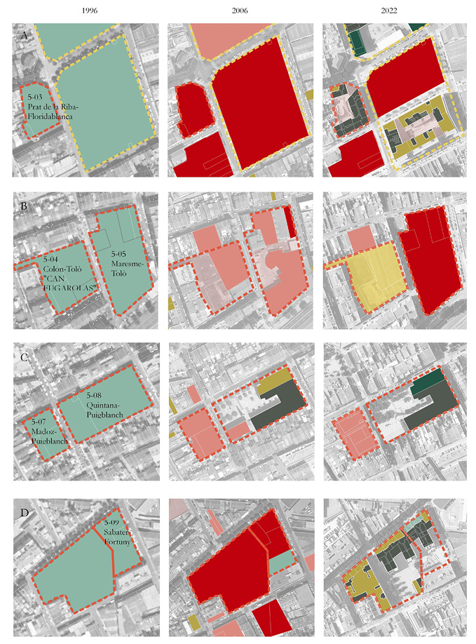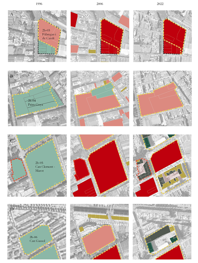 Tras la fase de actividad industrial anterior y previa a su desarrollo y ejecución, los sectores transitan largos periodos (entre cuatro y hasta veinticinco años) en los que, primero en forma de edificios y después de solares, el vacío emerge. La Figura 5 y la Figura 6 muestran la evolución de los sectores de reindustrialización y remodelación, respectivamente.