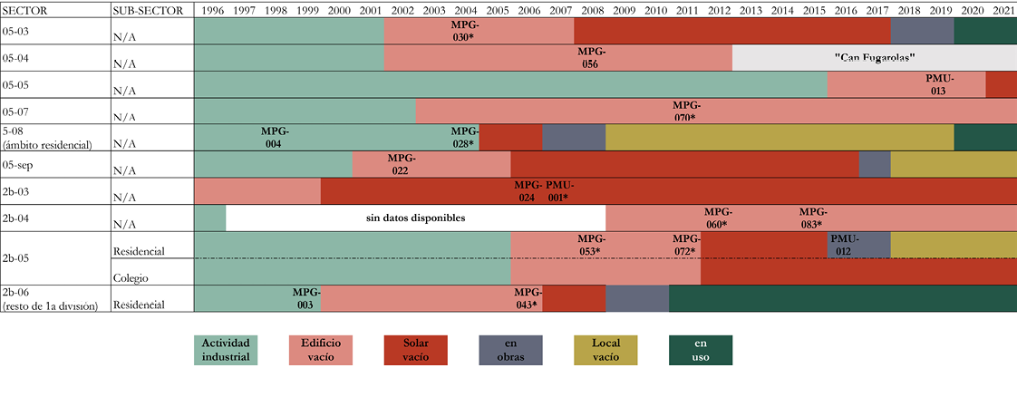 Desde un punto de vista cronológico, no es posible, en este punto, establecer una relación de causalidad entre la tramitación del planeamiento y el abandono de la actividad económica previa o la transición de los tipos de vacíos. Las primeras MPG se producen tanto con anterioridad como después del cese de la actividad previa, incluso después del derribo de los edificios industriales (2b-03). Por otra parte, las sucesivas revisiones y modificaciones de la planificación no son garantía, cuando menos a nivel temporal, del desarrollo de los sectores urbanísticos. El periodo de tiempo transcurrido desde la primera MPG hasta el inicio de las obras en los sectores ejecutados va de los ocho a los quince años. No obstante, sí se apuntan algunas circunstancias recurrentes que vale la pena destacar. Por un lado, cierta correlación temporal –en forma de secuencia temporal– entre la aprobación de las primeras MPG (5-03 y 5-09) y el derribo de las anteriores edificaciones, muchas de ellas ya sin uso, seguidas de largas fases de solares vacíos. En sentido contrario, también se observa reactivación en varios de los sectores (5-08, 2b-05 y 2b-06) tras las correspondientes segundas MPG, en las que, entre otros aspectos, se cambia el sistema de actuación de compensación (privado) por el de cooperación (público).