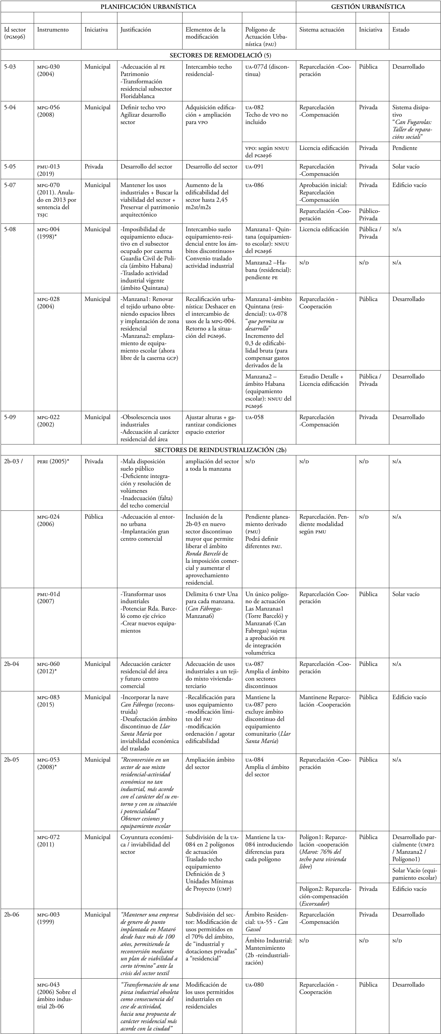 Entre los sectores urbanísticos a los que se refiere el PGM96, se encuentran los Sectores de Remodelación (Clave 5) y los Sectores de Reindustrialización (Clave 2b), objeto de nuestro análisis (Figura 2). De hecho, el PGM96 vino a recoger algunas de las disposiciones del plan anterior (PlaMat77), entre ellas la de los Sectores de Remodelación que, si bien ya habían sido delimitados por el PlaMat77 para su transformación, mantenían todavía su actividad industrial. En el caso de los Sectores de Remodelación, el planeamiento consideró que “la ubicación industrial estaba desencajada del tejido productivo y no se adaptaba al sector residencial característico de su entorno” (Ajuntament de Mataró, 1997a, p. 121). Por su parte, los Sectores de Reindustrialización se describen como “suelos ocupados por grandes industrias respecto de los cuales el PGM96, a pesar de considerarlos como sector industrial, posibilitaba su transformación futura” (Ajuntament de Mataró, 1997a, p. 121). Paradójicamente, y en paralelo a esta supuesta protección de la actividad industrial preexistente, dicho informe de alegaciones también incluyó un aumento de la edificabilidad de los 1,5 m² iniciales a 1,8 m² techo/m² suelo.