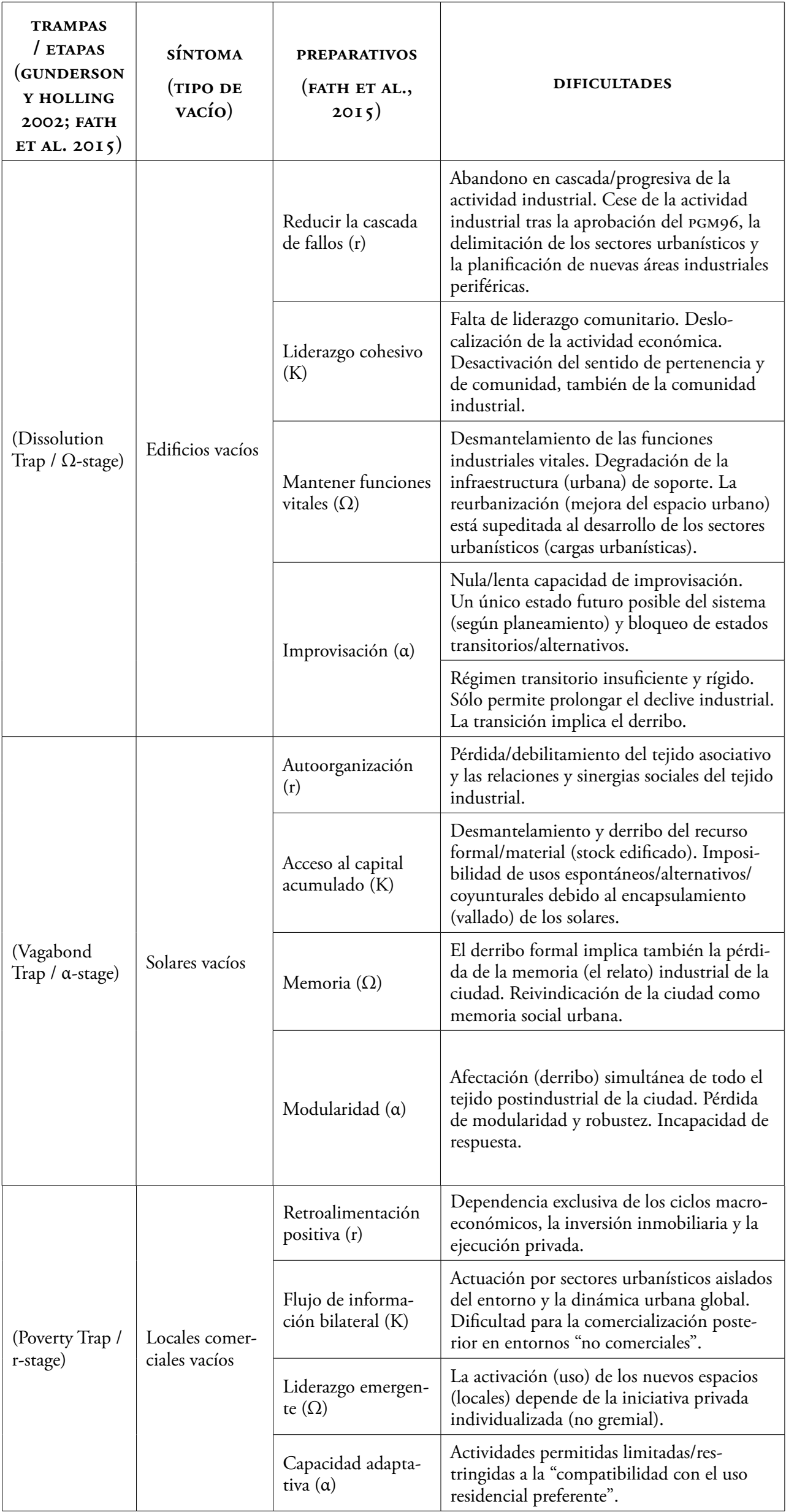 Tal como muestran los resultados, el planeamiento urbanístico se muestra insuficiente al abordar la regeneración de los tejidos industriales. Lejos de seguir la trayectoria –cuando menos temporal– trazada por la planificación, los procesos planificados de transformación de antiguas áreas industriales en la ciudad de Mataró exhiben dificultades y obstáculos que retardan o incluso impiden su desarrollo. Así, la alteración de la línea temporal predefinida se hace visible en la aparición, permanencia y mutación de vacíos urbanos en los sectores de transformación y de reindustrialización sujetos al Plan General de 1996. Volviendo sobre Žižek (2003), el vacío nos permite reconstruir el marco temporal y analizar las condiciones pasadas que han desencadenado la situación actual. El vacío urbano, por tanto, se presenta como el síntoma que, en sus distintas etapas, evidencia las debilidades del proceso planificado para superar las sucesivas trampas (traps) y dolencias (ailments) definidas en nuestro marco de análisis (Fath et al., 2015).