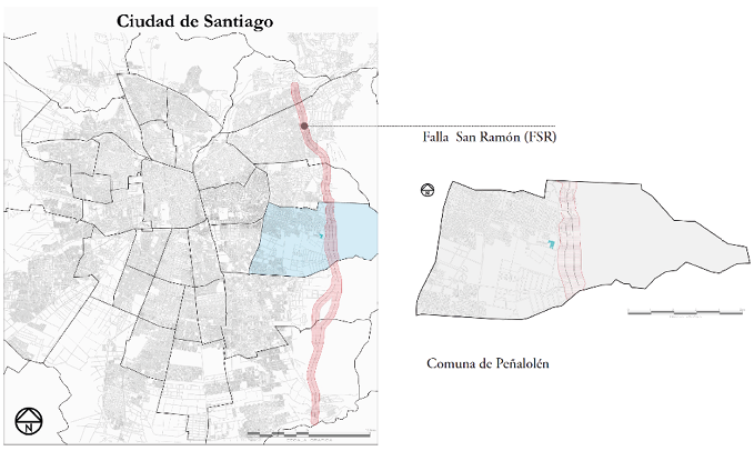 Audefroy (2003) señala que en los últimos años se ha presentado un crecimiento poblacional concentrado principalmente en zonas urbanas asociadas al riesgo, generando importantes desastres del tipo sísmico, aluviones e incendios forestales. Por su parte, la Falla San Ramón comienza a ser mencionada como un factor de riesgo desde la década de 1950 (Armijo et al., 2010), cuando se detectó la posible existencia de una falla a los pies del frente cordillerano (Aránguiz, 2018). Se ha precisado al respecto que “la falla del cerro San Ramón” constituye “el pie rectilíneo de la cordillera de Los Andes que se puede seguir por 40 kilómetros” (Brüggen, 1950). Desde esa descripción, mucho conocimiento se ha acumulado en materia técnica, lo que permite describir la Falla San Ramón como un objeto geológicamente activo que afecta el piedemonte de Santiago (Easton et al., 2018), lo que se refleja en una situación de riesgo latente para la ciudad y sus habitantes (Figura 1).