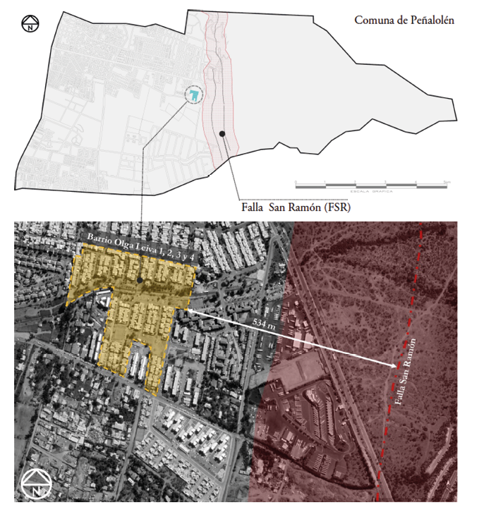 El barrio Olga Leiva fue parte del llamado a concurso 2020 del Programa “Quiero Mi Barrio”, por lo que la Etapa I de Diagnóstico fue ejecutada a lo largo del año 2021, teniendo como resultado un plan maestro integral para finales de ese mismo año. Respecto a su localización, el barrio Olga Leiva es el más próximo a la Falla San Ramón en el cual se haya implementado el PQMB. Se ubica en la comuna de Peñalolén, a 534 metros del buffer o área de riesgo directo de la traza de la Falla (Figura 2), siendo un ejemplo de crecimiento urbano en extensión sobre áreas de riesgo sísmico (I. Municipalidad de Peñalolén, 2020).