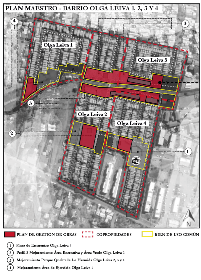 Como fuera identificado, la Falla San Ramón corresponde a una falla geológica activa de 10 a 12 km de profundidad, con riesgo de ruptura superficial de 100 metros hacia el oriente de su traza, lo que implica una preocupación inminente, considerando la localización de viviendas en el barrio Olga Leiva. Las intervenciones resultantes del Plan Maestro del “Quiero Mi Barrio” fueron cuatro y abarcaron las cuatro copropiedades que conforman el barrio (Figura 3):