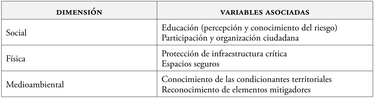 Respecto a la resiliencia multidimensional, se incluye la Tabla 1, que relaciona las distintas dimensiones –social, física y medioambiental– descritas en el planteamiento teórico, con variables asociadas para cada una.