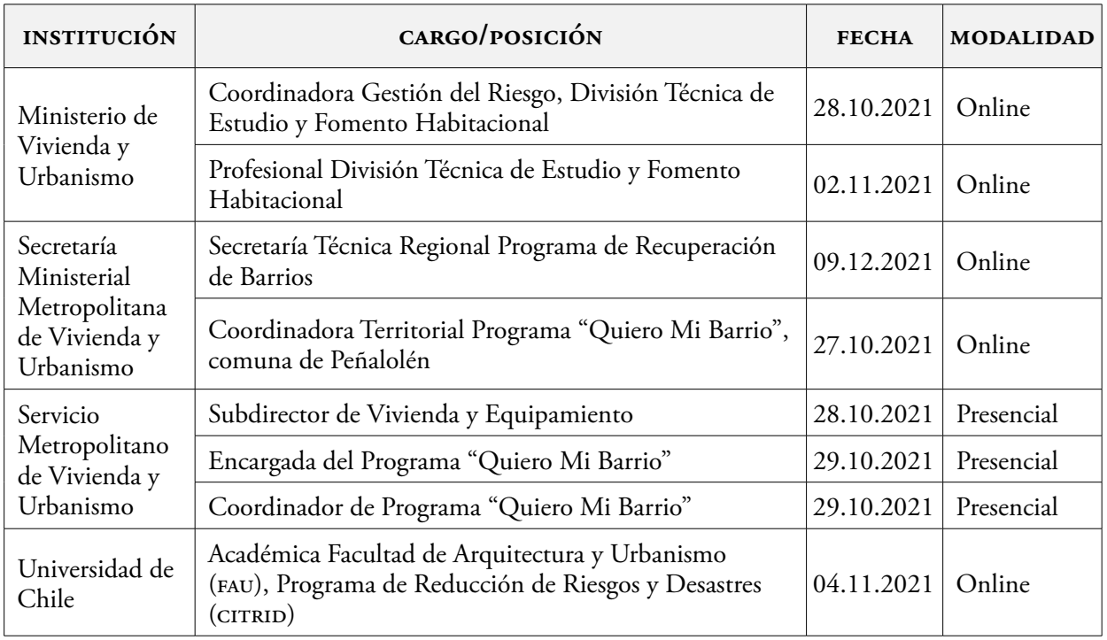 Además, se incluyen entrevistas semiestructuradas a profesionales expertos del área pública y de la academia relacionados a temas de riesgo y al Programa “Quiero Mi Barrio” (Tabla 2). Las entrevistas fueron realizadas en el periodo que abarca desde el 28 de octubre al 4 de noviembre de 2021. Del total de entrevistas, cinco fueron realizadas de forma telemática, dada la contingencia de la pandemia Covid-19. Se extrajeron citas relacionadas a cada variable asociada, las cuales se categorizaron para ser aplicadas en los resultados como propuestas de estrategias para implementar en Fase I: Diagnóstico, Fase II: Implementación, y Fase III: Cierre del Programa “Quiero Mi Barrio”.