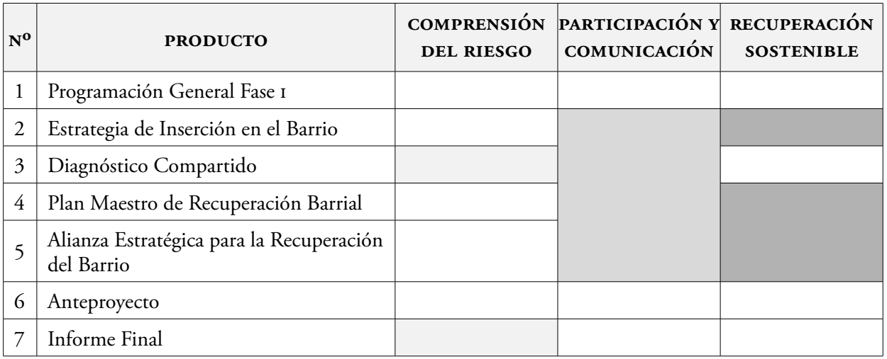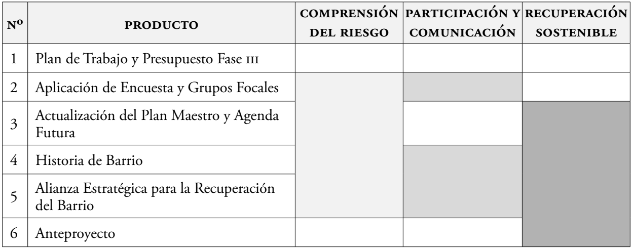 Respecto a la propuesta de estrategias para la Fase I, en la Tabla 3 se destacan las dimensiones de Participación y Comunicación y la de Recuperación Sostenible, que deberían estar presentes o implementadas como las más importante en la mayoría de los productos que se detallan; entre ellos, la estrategia de inserción del barrio, el plan maestro propiamente tal y la alianza estratégica para la recuperación del barrio. La Comprensión de Riesgo se establece como crucial tanto para elaborar la estrategia de inserción en el barrio como en el informe final.