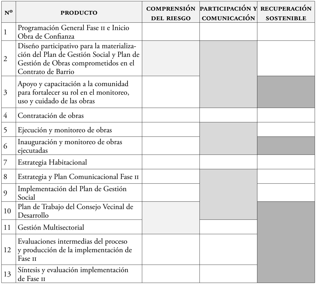 Respecto a la propuesta de estrategias para la Fase II, la Tabla 4 muestra una supremacía de la aplicación de las dimensiones de Participación y Comunicación y Recuperación Sostenible, al igual que en la fase anterior, pero esta vez con mayor énfasis en los productos relacionados con la ciudadanía; entre ellos, el plan de trabajo del Consejo Vecinal de Desarrollo, la gestión multisectorial, las evaluaciones intermedias del proceso y producción, así como la síntesis y evaluación de la implementación de la Fase II. En esta etapa, la Comprensión del Riesgo se establece como una estrategia que nutre el diseño participativo tanto para la materialización del Plan de Gestión Social y el Plan de Gestión de Obras comprometidos en el Contrato de Barrio, como en el plan de trabajo del Consejo Vecinal de Desarrollo y la gestión multisectorial.