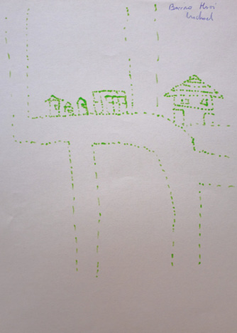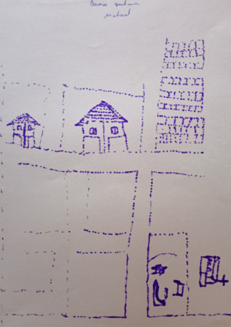 Por último, en la representación de la casa y su papel en la configuración del entorno barrial, tanto de Haití como de Quilicura y Estación Central, cabe señalar, en el caso de Haití, la presencia de parientes cercanos en el entorno del barrio, lo que refuerza el énfasis en lo comunitario que ha sido destacado como clave de lectura de las adscripciones socioculturales que definen la vida social en Haití. Tal es el caso de la representación elaborada por Ludnick Zidor (Figura 8), quien incorpora en el dibujo de la casa la presencia de dos tías como vecinas, imagen que contrasta con la representación de la casa en Estación Central, donde no se identifica la presencia de familiares o amigos en el vecindario. En este sentido, estas cartografías de la casa no dan cuenta de lo señalado en las biografías migrantes, donde la presencia de haitianos en el entorno barrial constituye un elemento clave: la casa se presenta únicamente desde sus características espaciales y morfológicas y no desde la presencia de elementos vinculados con las prácticas sociales o de los sujetos que las habitan.