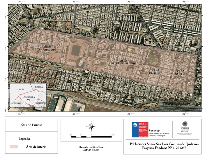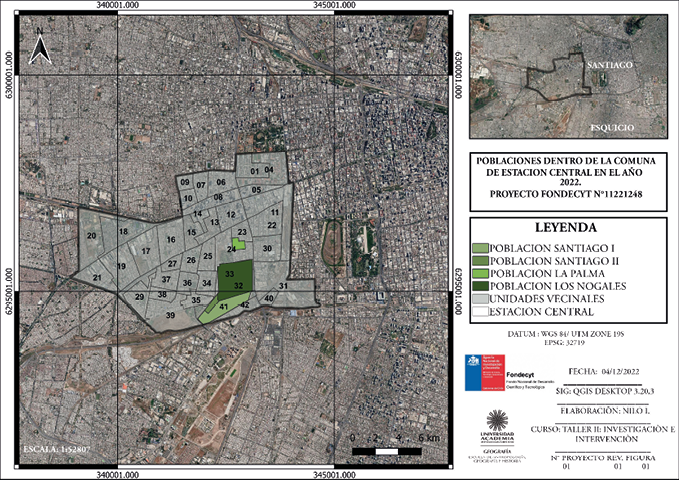 Cabe destacar que la investigación se llevó a cabo en dos sectores específicos de cada una de las comunas seleccionadas, correspondientes a aquellos en los que se concentra la mayor cantidad de población haitiana, tanto en Quilicura como en Estación Central. En el caso de la comuna de Quilicura, tal como se detalla en su Plan Regulador, la población haitiana se ubica principalmente en dos de sus macrosectores: Maestranza y San Luis. En este sentido, las biografías migratorias, así como los mapas cognitivos, fueron aplicados a residentes de San Luis (Figura 1). Por su parte, en el caso de la comuna de Estación Central, la población haitiana se emplaza mayoritariamente en las poblaciones Santiago I, Santiago II, La Palma y Los Nogales (Figura 2), que corresponden mayoritariamente al sector denominado genéricamente como Los Nogales, compuesto por un conjunto de poblaciones que se caracterizan por viviendas antiguas de fachada continua, las que han sido divididas en habitaciones que son arrendadas a familias haitianas; por tanto, corresponden a cités y conventillos. La macrozona San Luis de Quilicura, por su parte, está configurada por conjuntos de blocks de vivienda social que acogen a la población haitiana.