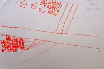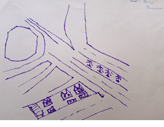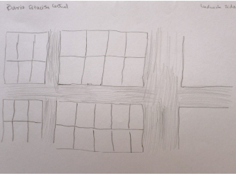 En el caso del mapa cognitivo de Quilicura trazado por Amos (Figura 3), sobresalen la presencia de vegetación, a partir del dibujo de una hilera de árboles que parecen ser palmeras, así como de una suerte de rotonda. Destaca también una gran avenida que divide el barrio en el que se emplazan las casas y que da cuenta de la morfología propia del entorno de Quilicura, comuna caracterizada por la presencia de condominios cerrados. Esta representación contrasta con el mapa cognitivo realizado por Ludnick Zidor (Figura 4) sobre Estación Central, el que ilustra de manera muy clara la morfología de cuadrícula o damero propia de la configuración del centro de Santiago y que se distingue claramente de la representación elaborada por Amos del entorno barrial de Quilicura.