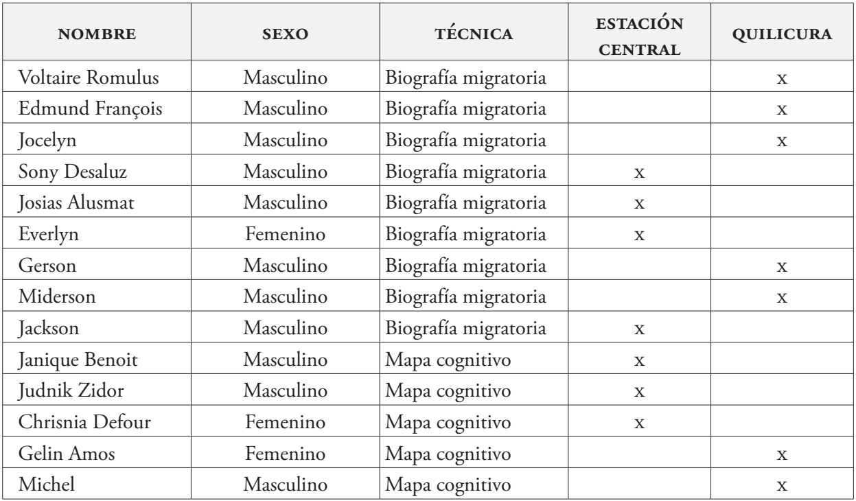 De las personas seleccionadas para el estudio, se aplicaron nueve biografías migratorias, cinco en Quilicura y cuatro en Estación Central; y cinco mapas cognitivos, tres en Estación Central y dos en Quilicura, las que se detallan a continuación (Tabla 1).