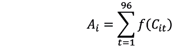 Una vez que el sistema evalúa todas las combinaciones posibles de ubicación/día/hora de la clínica para cada hogar, es posible calcular el índice de accesibilidad, que consiste en la cantidad de slots horarios (franjas horarias) en los que un individuo puede acceder a atención médica. Concretamente, los slots horarios son la cantidad de pares de horas y días (p. ej., lunes a las 15) en los que una persona puede acceder a la atención en al menos un lugar. El sistema evalúa esta capacidad para 96 combinaciones posibles, 16 para cada uno de los seis días desde el lunes a las 6 hasta el sábado a las 21, por lo que el índice varía de 0 a un máximo de 96. Formalmente, el cálculo se describe en la Ecuación (1):