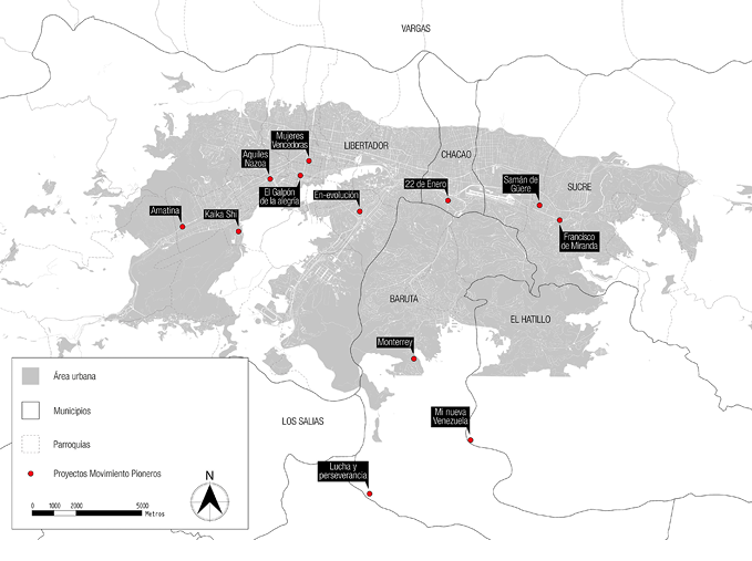 Aunque todas las organizaciones señaladas proyectan la autogestión como una dimensión transversal de su propuesta política, es el movimiento Campamentos de Pioneros el que la sitúa en el ámbito de la producción habitacional. A partir de sus propias definiciones, este movimiento defiende un modelo de acción fundado sobre tres principios: la propiedad colectiva, la autogestión y la ayuda mutua (MPV, 2015). Tras una década de lucha, el modelo de trabajo propuesto por este movimiento ha sido incorporado como parte de los proyectos habitacionales ejecutados en el marco de la Gran Misión Vivienda Venezuela (GMVV). En este contexto, el MPV ha autogestionado los medios de producción trasferidos por el Estado –financiamiento, maquinarias e insumos de construcción–. Y, junto con ello, ha autogestionado su propia capacidad de trabajo para el desarrollo de sus proyectos habitacionales (Cariola et al., 2014; HIC-AL, 2017). Actualmente, el movimiento tiene doce asentamientos que, sumados, involucran a casi 1700 familias en distintos sectores de Caracas (Figura 3) (HIC-AL, 2017).