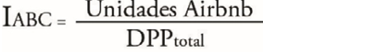 Tomam-se os anúncios de unidade inteiras como objeto de interesse para contraste com os aluguéis de curta e longa duração. São esses anúncios que potencialmente estarão em competição com o mercado de aluguéis. Nessa pesquisa, foi criado e aplicado o Índice Airbnb nas Cidades (IABC) que relaciona a quantidade de unidades inteiras anunciadas no Airbnb em cada município com o estoque imobiliário residencial disponível em cada município. Esse estoque imobiliário é aqui representado pela categoria “domicílio particular permanente” coletada no Censo 2010 e definida pelo IBGE (2010a): “domicílio construído a fim de servir exclusivamente para habitação e que, na data de referência, tem a finalidade de servir de moradia a uma ou mais pessoas” (p. 210). O índice é definido pela seguinte fórmula: