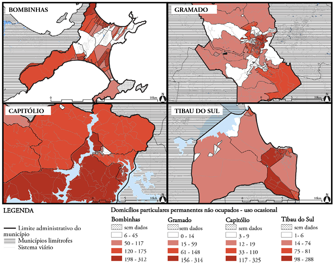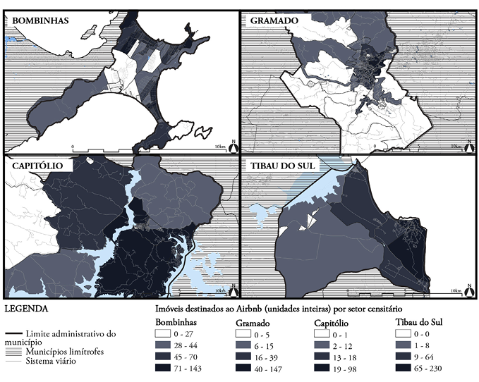 Entre as aproximações com outros estudos, foi notada a importância dos atrativos turísticos para a localização e concentração das unidades Airbnb, assim como relatado por Alizadeh et al. (2018) e Deboosere et al. (2019). Nas cidades brasileiras investigadas, as zonas com maior importância turística (próximas à frente de mar, lagoas, resorts, vias comercias turísticas) são as principais concentradoras de unidades Airbnb. Gramado é o exemplo em que esse fato é notado com maior clareza: as proximidades das Avenidas das Hortênsias e Borges e Medeiros é onde estão localizados os setores censitários com maior presença do Airbnb. Em Capitólio, a proximidade com o lago de Furnas, especialmente o condomínio Escarpas do Lago, importante atrativo turístico da cidade é essencial para definição das localizações da maior parte das unidades Airbnb. E nas cidades litorâneas, Tibau do Sul e Bombinhas, a frente de mar e, mais do que isso, as praias mais visitadas são as concentradoras de unidades Airbnb. Portanto, nesse aspecto, essa pesquisa apresenta aproximações com outras investigações semelhantes.